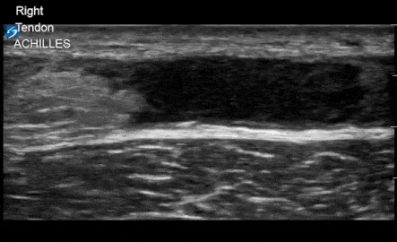 This can be visualized in both a short and long view. Pain in the tendon, good story plus ultrasound can be diagnostic. Track the tendon down using the probe. Here’s the long view with an intact and ruptured tendon.