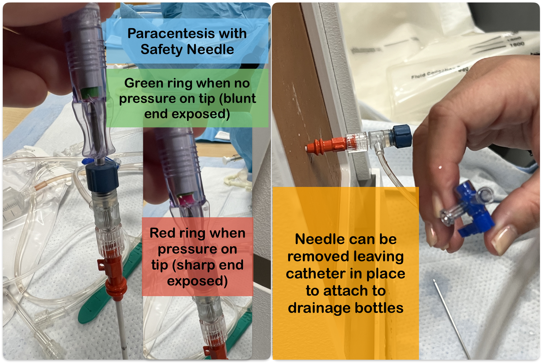 The paracentesis safety needle has a blunt tip to help avoid puncture bowel during insertion. When pressure is applied to the tip, the ring turns red, and the blunt end retracts exposing the sharp end. This allows the needle to penetrate through skin and other tissues. When there is no pressure on the tip, the ring is green, and the blunt end is exposed. If this blunt end encounters bowel, it should just move out of the way.