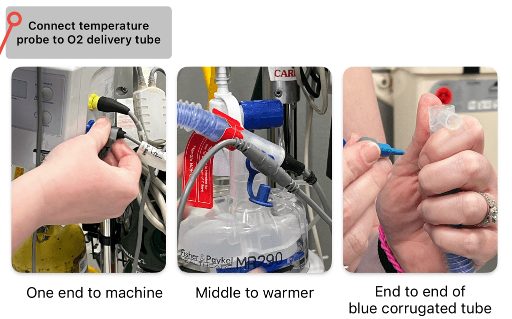 - The middle connects to the humidifier at the takeoff of the heated circuit (blue corrugated tubing)