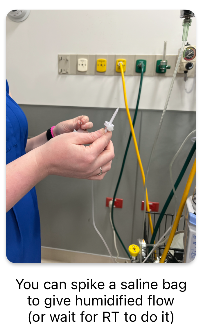 - Connect oxygen tubing from the top of the humidifier plate to one of the two oxygen flow meters. One has finer control but a smaller range. Aim for 2 L/kg and pick the appropriate flow meter.