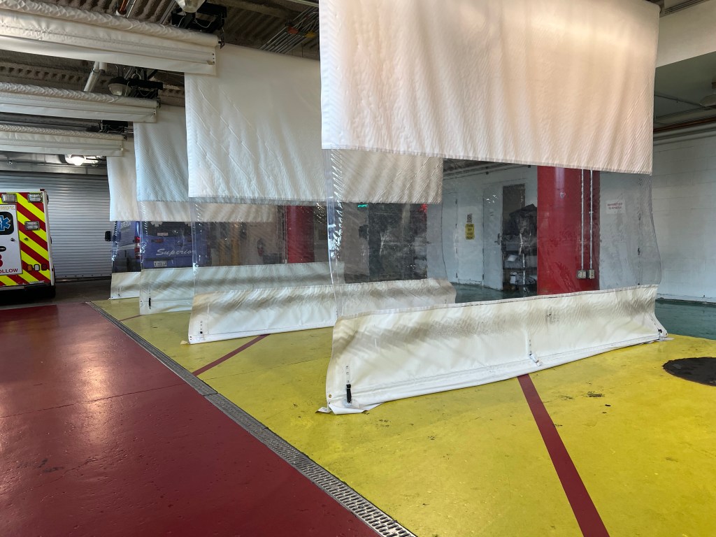 The Emergency Department and its ambulance bay at Rush Hospital has been specifically designed to manage disasters. There is water available for decontamination, heat lamps to warm up cold and wet patients after washing, and even a separate water collecting system to avoid putting contaminants back into Chicago’s watery supply. As shown above and below there are hot, warm and cold zones designated.